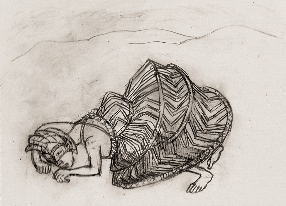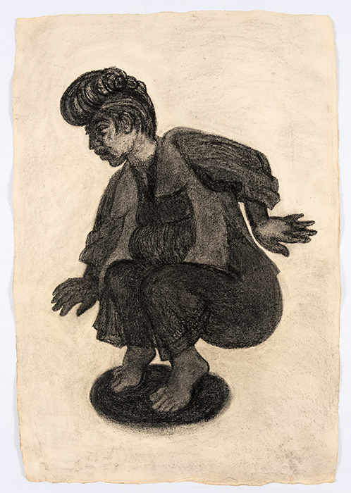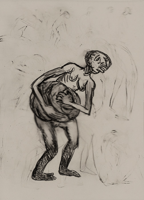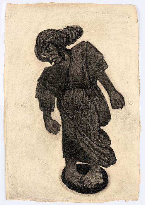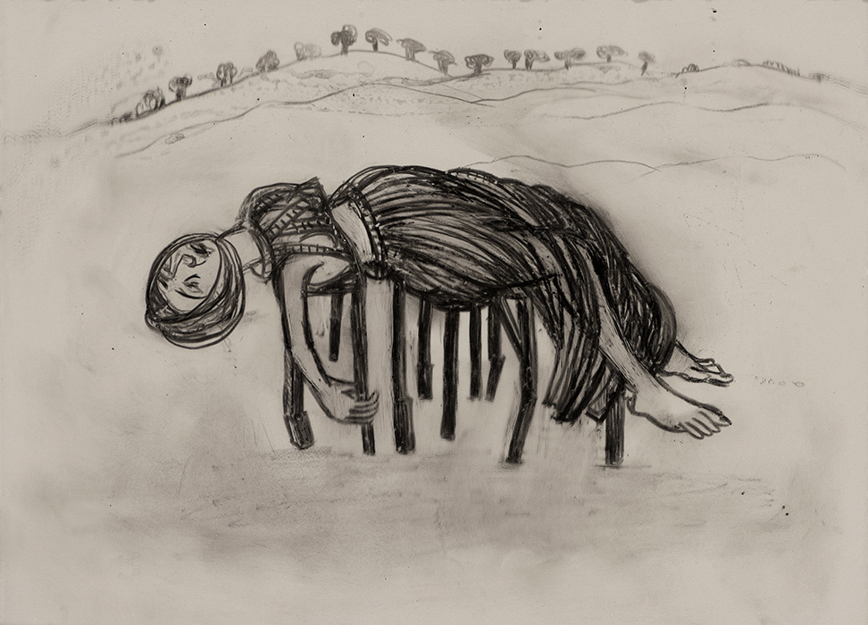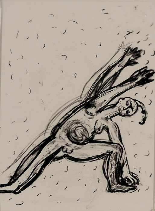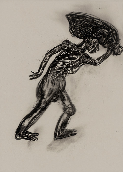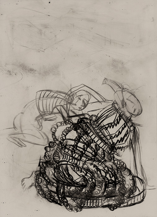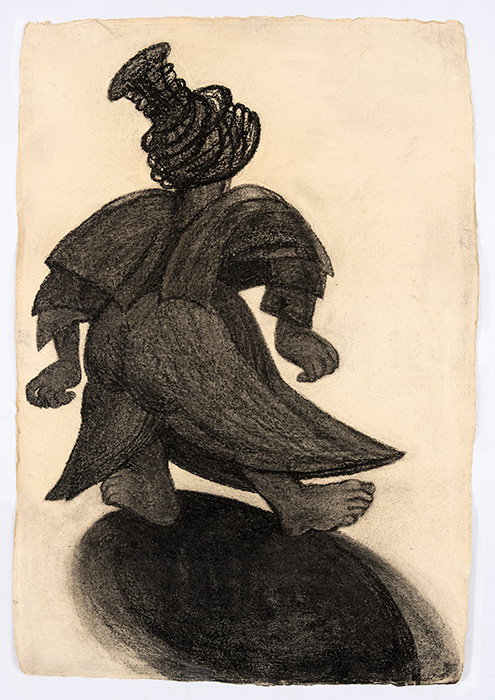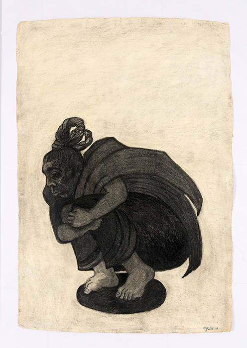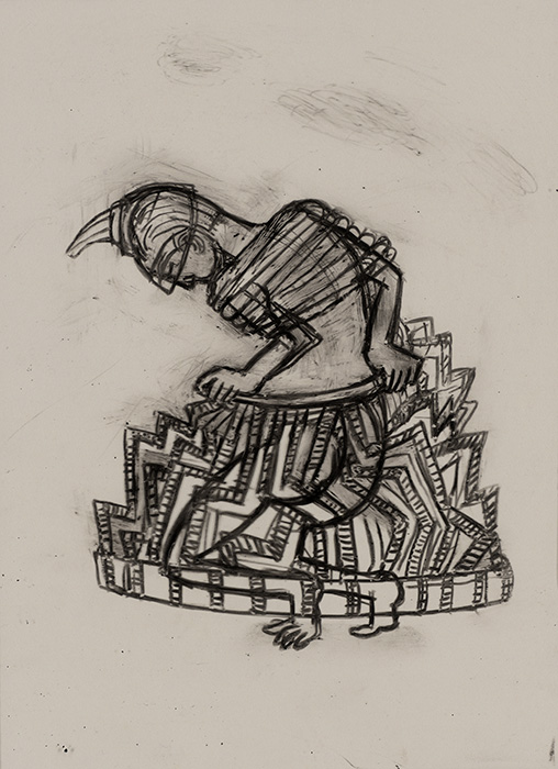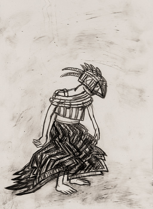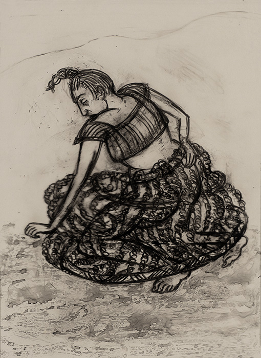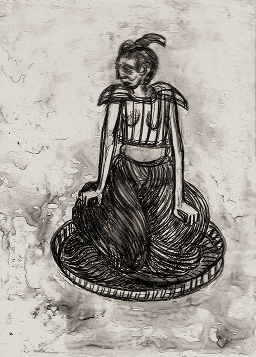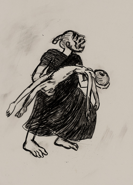 The subjects of the drawings in this exhibition are mostly single figures, female, male or androgynous. We see single female figures standing, walking or in different postures. At times they seem to be performing some exercises. We see women walking in a procession. We also see grieving women with a sick or dead child, variations on the pieta theme. The female figures are usually stout, showing signs of having born children. They are drawn at times with multiple pairs of breasts. They seem like fertility figures, seen here in a somewhat degraded state, unlike the highly revered traditional figurines. We also see helpless migrant workers trudging along as if in a trance, their bodies desperately trying to maintain balance. Defeated warriors, their broken armour now a burden rather than a protection, fall to the ground. Human bodies take on peculiar forms, costumes becoming fused with the bodies giving them bizarre, surreal or mythic and futuristic appearances.