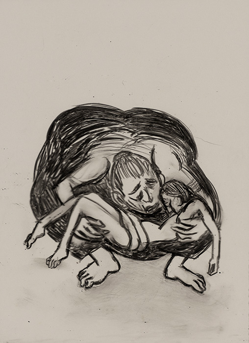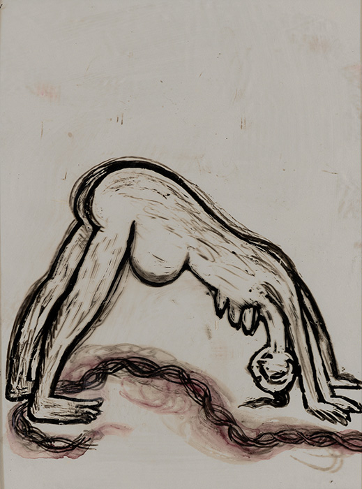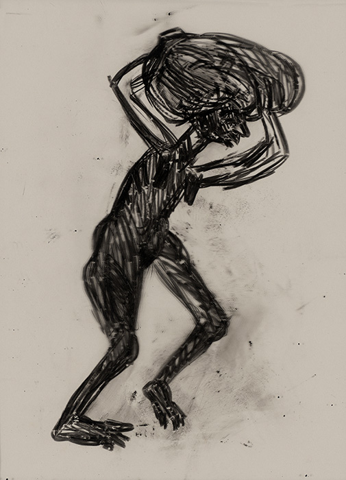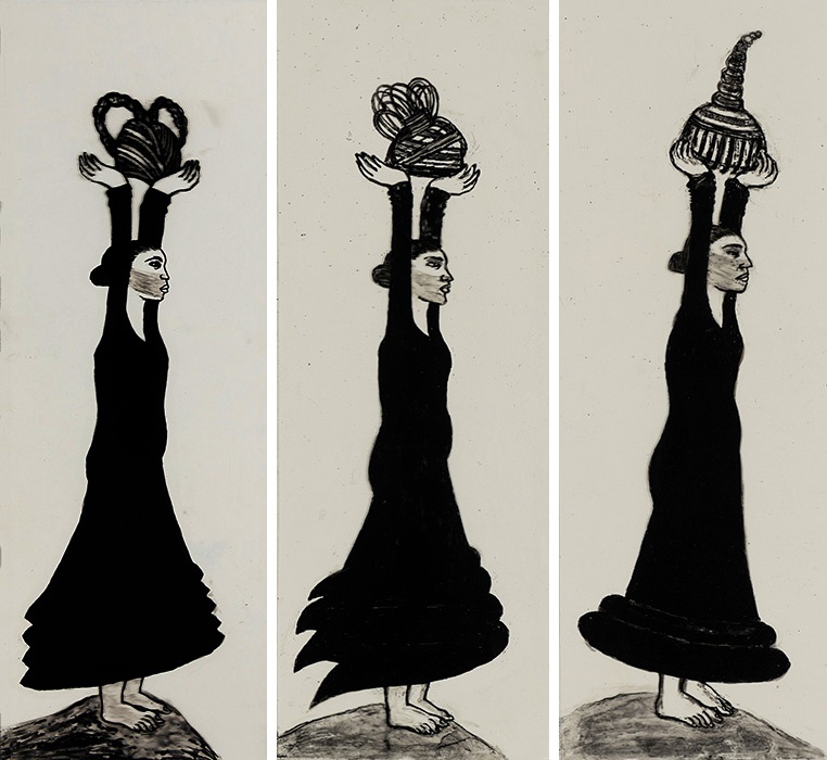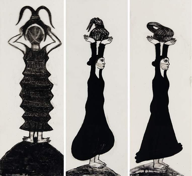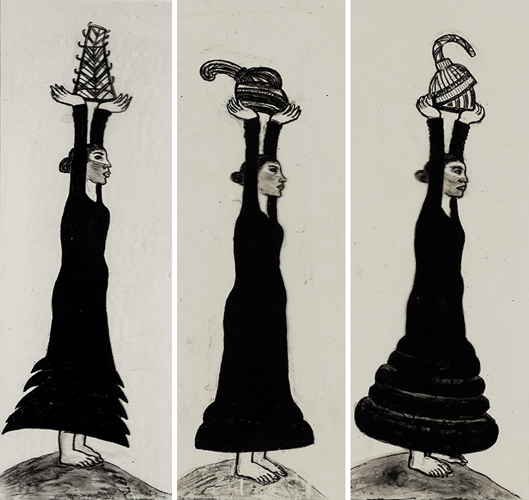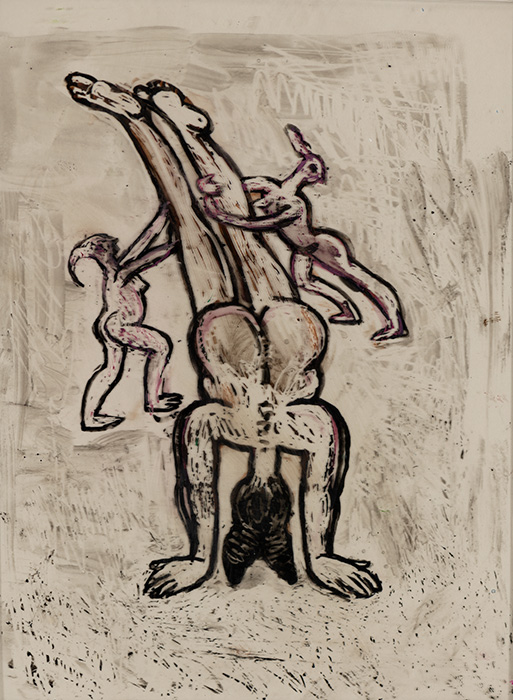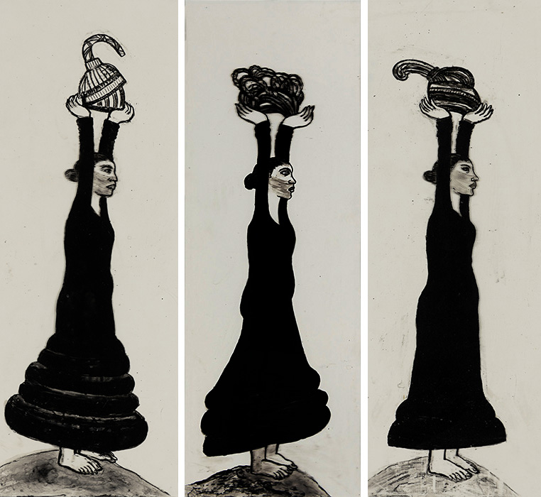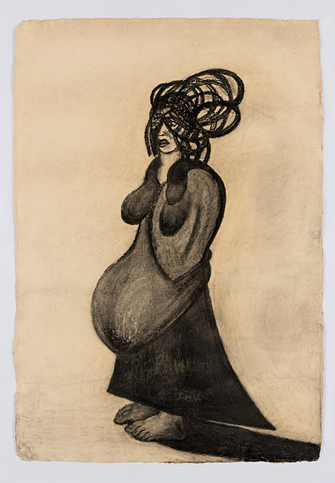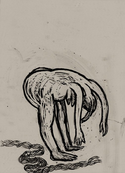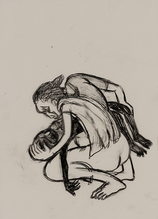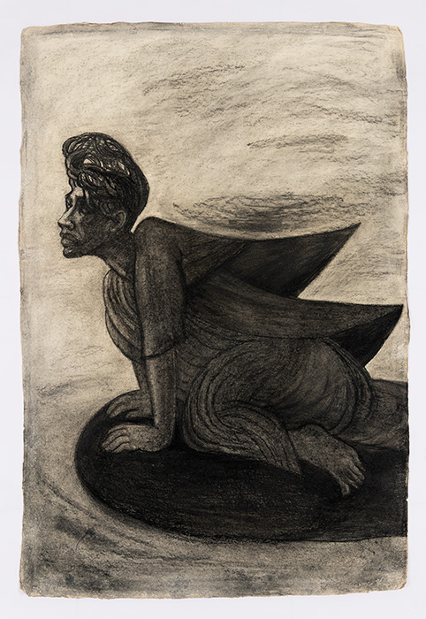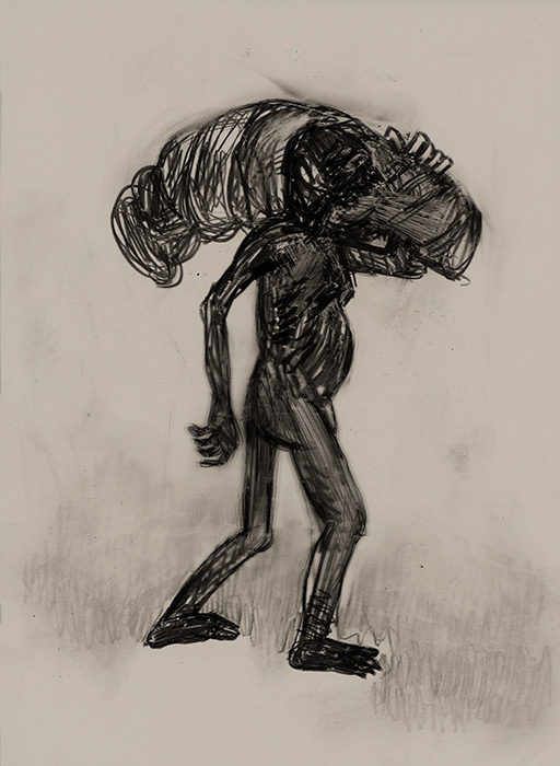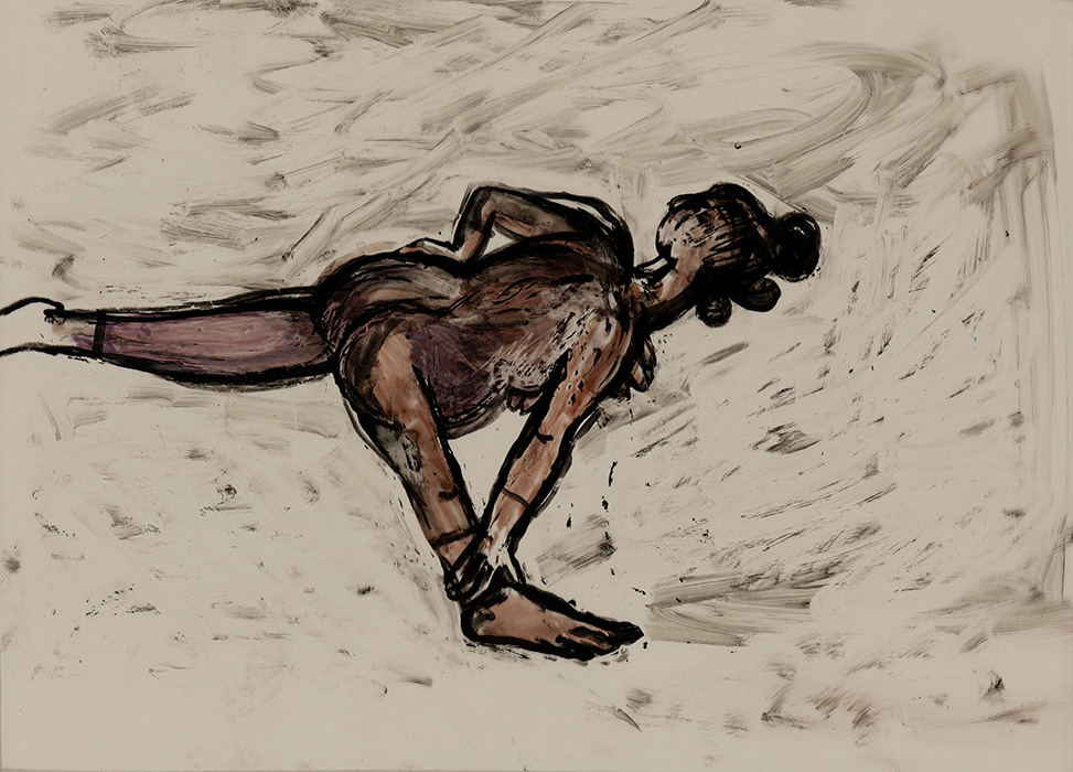 The subjects of the drawings in this exhibition are mostly single figures, female, male or androgynous. We see single female figures standing, walking or in different postures. At times they seem to be performing some exercises. We see women walking in a procession. We also see grieving women with a sick or dead child, variations on the pieta theme. The female figures are usually stout, showing signs of having born children. They are drawn at times with multiple pairs of breasts. They seem like fertility figures, seen here in a somewhat degraded state, unlike the highly revered traditional figurines. We also see helpless migrant workers trudging along as if in a trance, their bodies desperately trying to maintain balance. Defeated warriors, their broken armour now a burden rather than a protection, fall to the ground. Human bodies take on peculiar forms, costumes becoming fused with the bodies giving them bizarre, surreal or mythic and futuristic appearances.