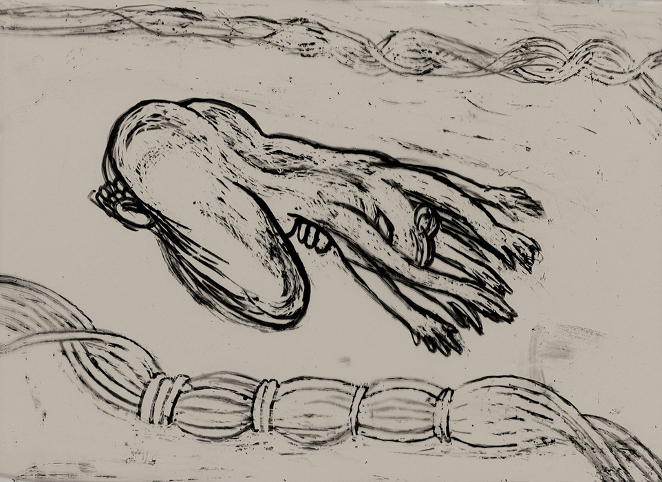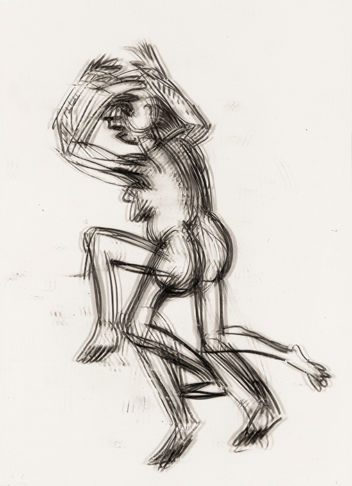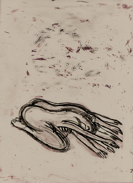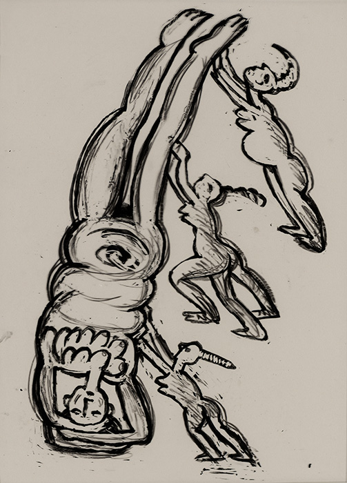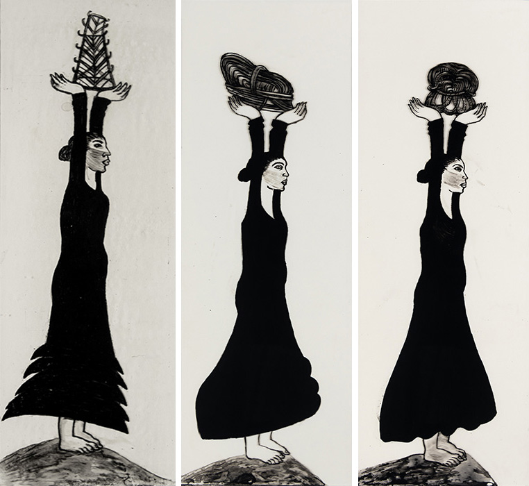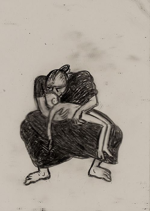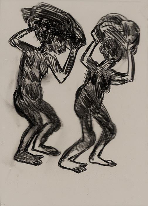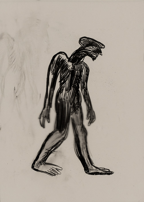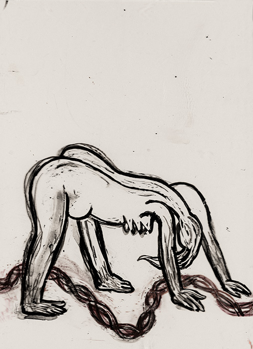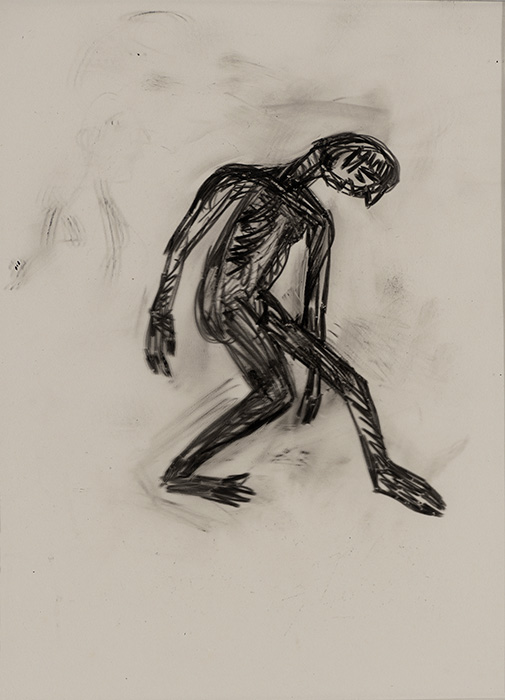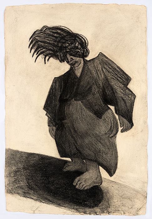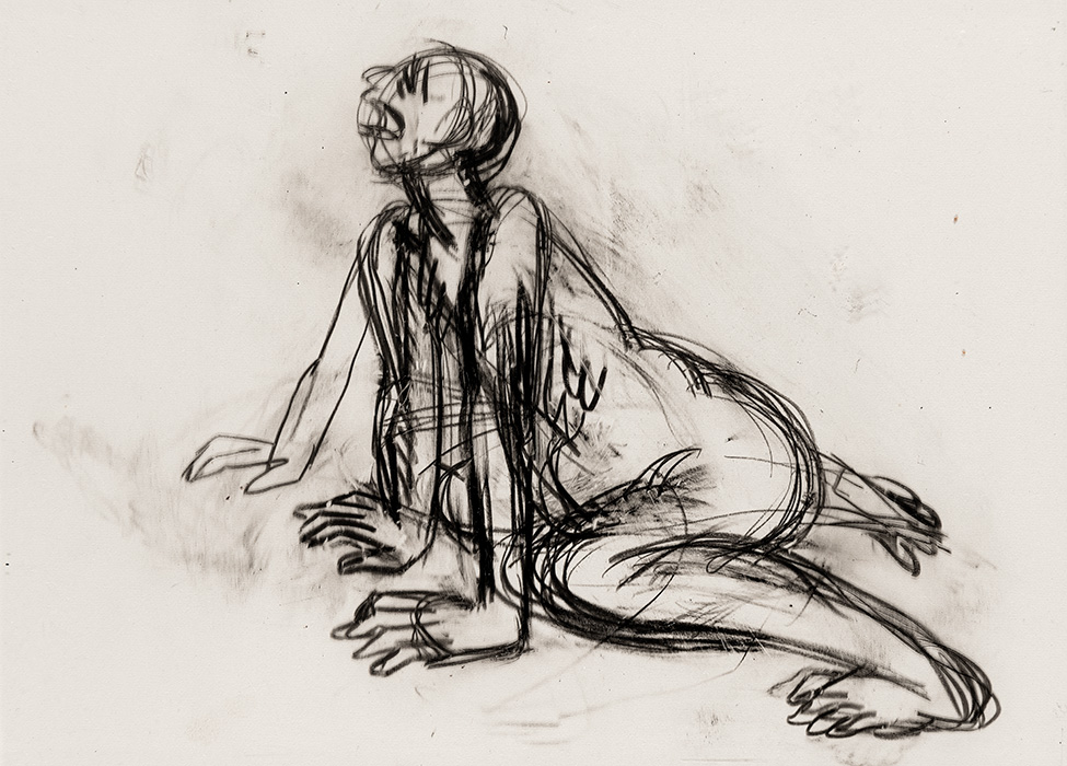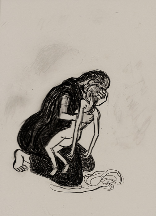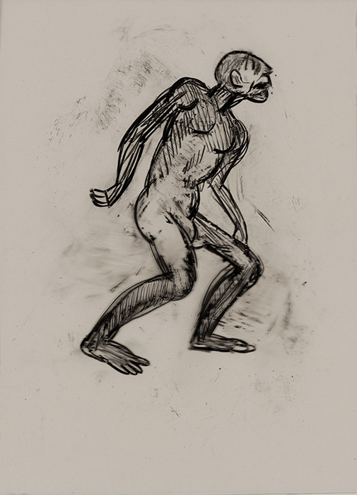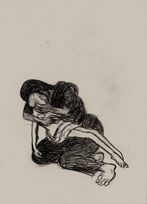 The subjects of the drawings in this exhibition are mostly single figures, female, male or androgynous. We see single female figures standing, walking or in different postures. At times they seem to be performing some exercises. We see women walking in a procession. We also see grieving women with a sick or dead child, variations on the pieta theme. The female figures are usually stout, showing signs of having born children. They are drawn at times with multiple pairs of breasts. They seem like fertility figures, seen here in a somewhat degraded state, unlike the highly revered traditional figurines. We also see helpless migrant workers trudging along as if in a trance, their bodies desperately trying to maintain balance. Defeated warriors, their broken armour now a burden rather than a protection, fall to the ground. Human bodies take on peculiar forms, costumes becoming fused with the bodies giving them bizarre, surreal or mythic and futuristic appearances.