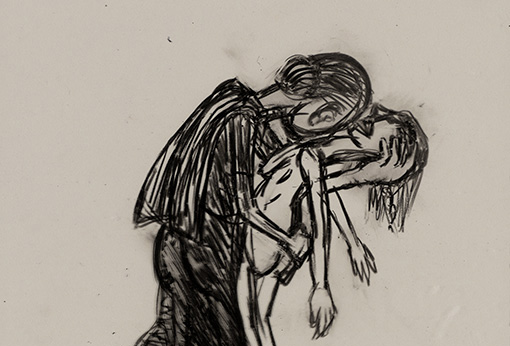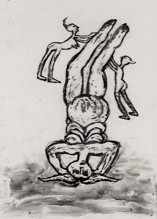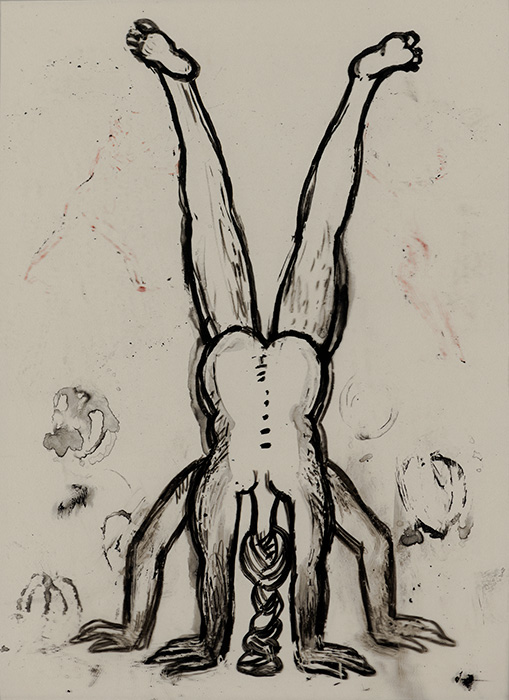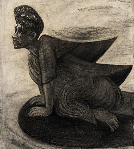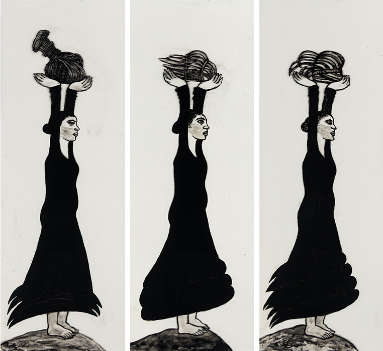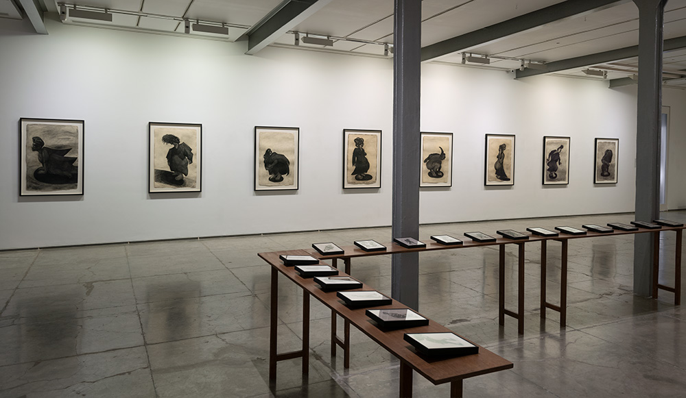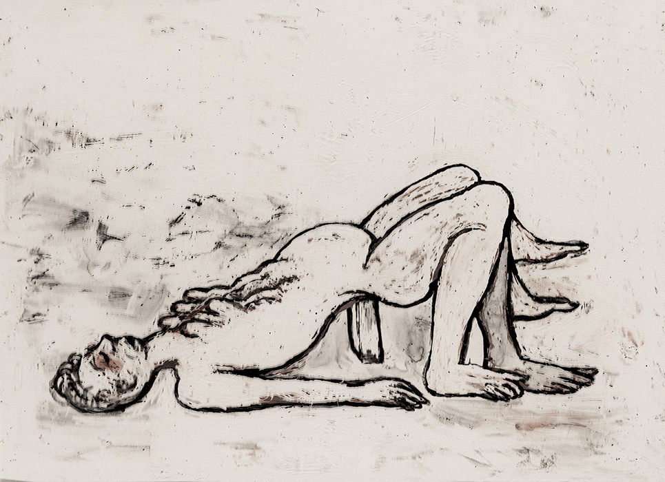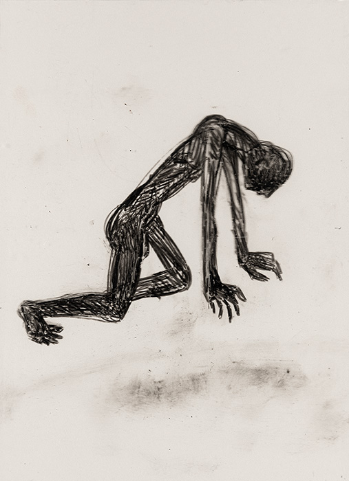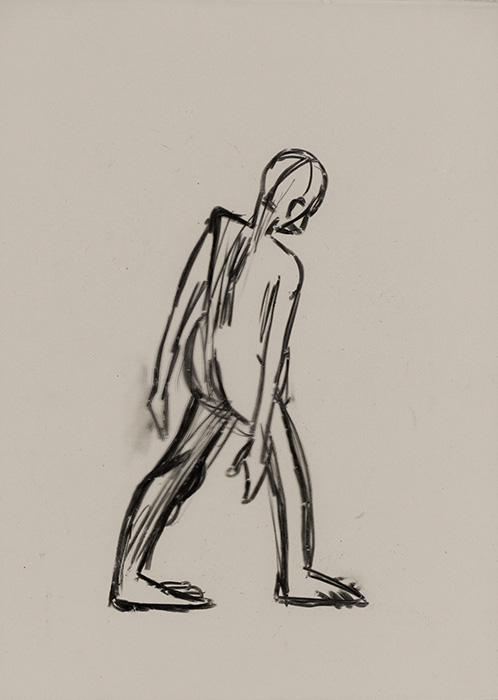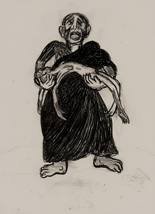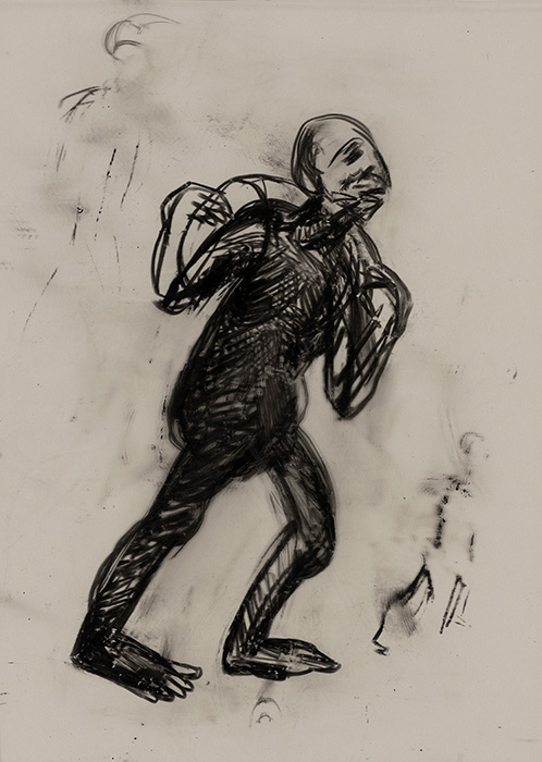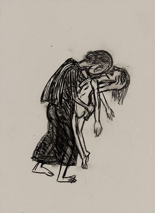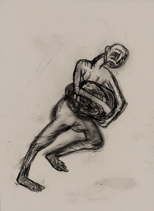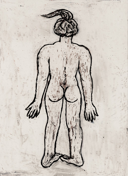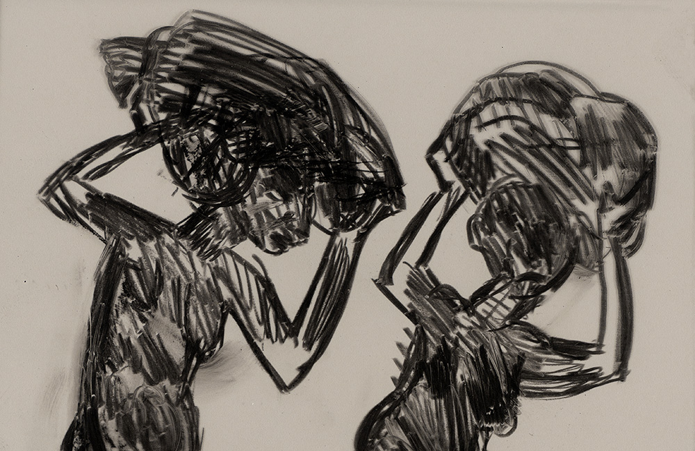 The subjects of the drawings in this exhibition are mostly single figures, female, male or androgynous. We see single female figures standing, walking or in different postures. At times they seem to be performing some exercises. We see women walking in a procession. We also see grieving women with a sick or dead child, variations on the pieta theme. The female figures are usually stout, showing signs of having born children. They are drawn at times with multiple pairs of breasts. They seem like fertility figures, seen here in a somewhat degraded state, unlike the highly revered traditional figurines. We also see helpless migrant workers trudging along as if in a trance, their bodies desperately trying to maintain balance. Defeated warriors, their broken armour now a burden rather than a protection, fall to the ground. Human bodies take on peculiar forms, costumes becoming fused with the bodies giving them bizarre, surreal or mythic and futuristic appearances.