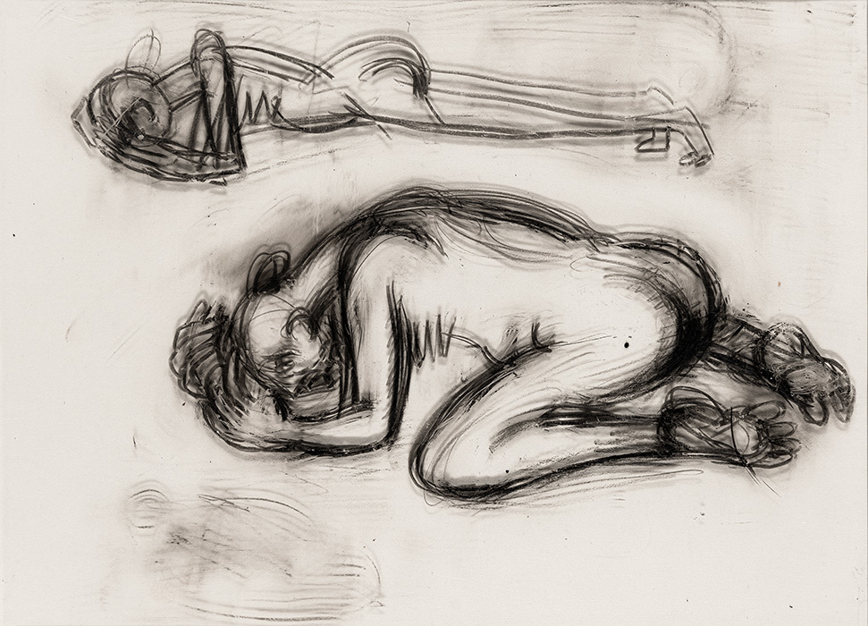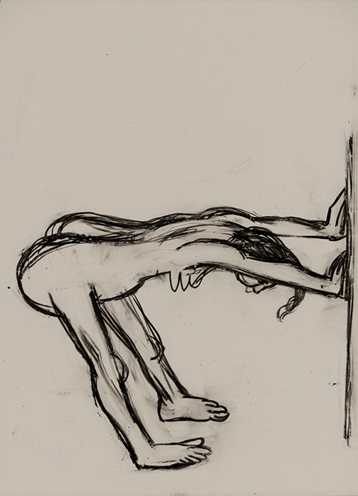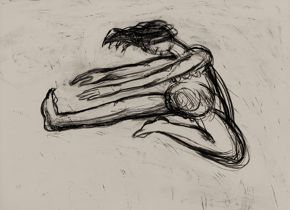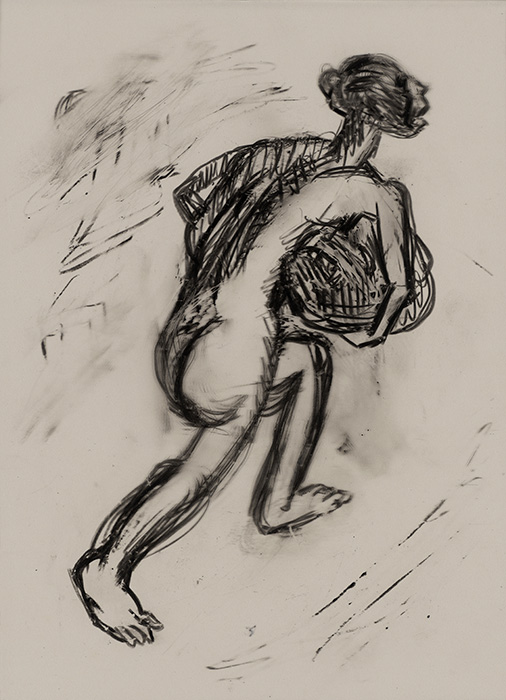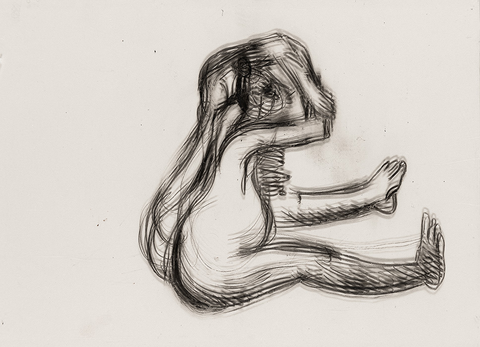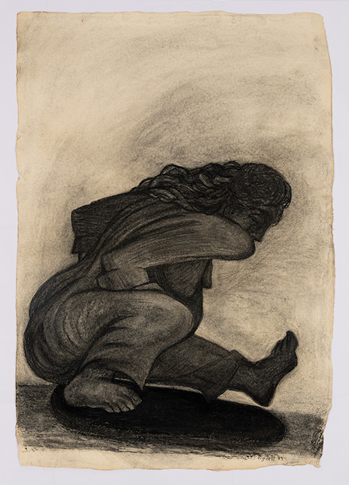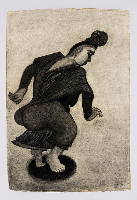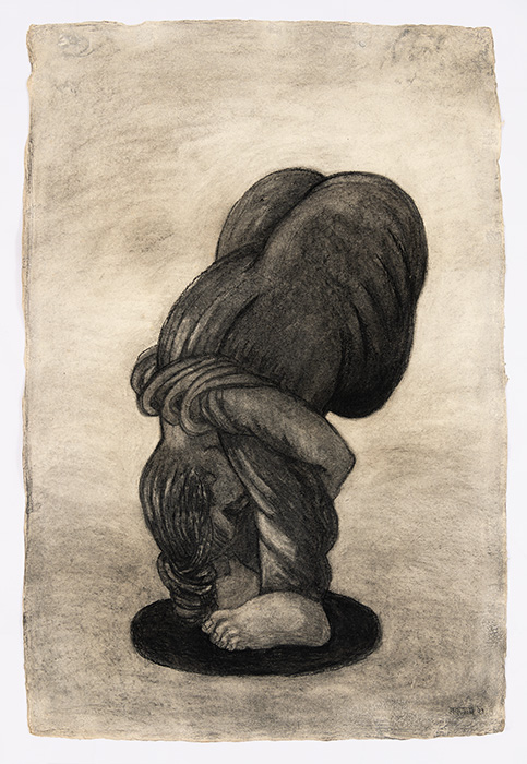 In a series of dense charcoal drawings done on large handmade papers, the artist seems to turn inwards seeking the center of gravity in a turbulent and labyrinthine mass of forms. There are moments when the bodies seem about to topple over, only to be saved by their instinctive sense of balance. The bodies are either struggling to get out of, or trying to remain within the shadows cast by their own selves. These powerful works highlight the ambivalent relation between safety and freedom, between the need to remain within one’s safe zone and the need to step out, between sanctuary and prison. The series powerfully articulates the struggle with the self that is the ultimate hurdle to emancipation. They strongly exemplify the introspective and assertive qualities in Shakuntala’s work mentioned above. In their strange inward silence, they suggest that only woman herself can be her own saviour. The decision is ultimately hers alone.