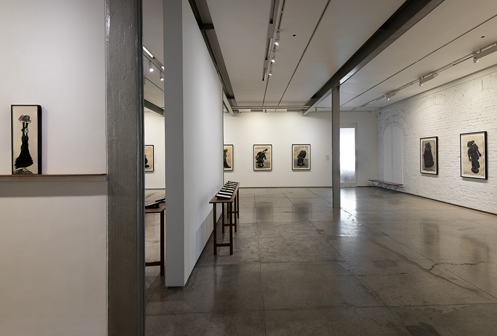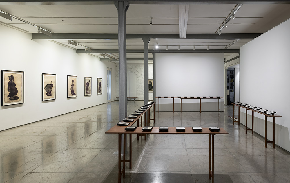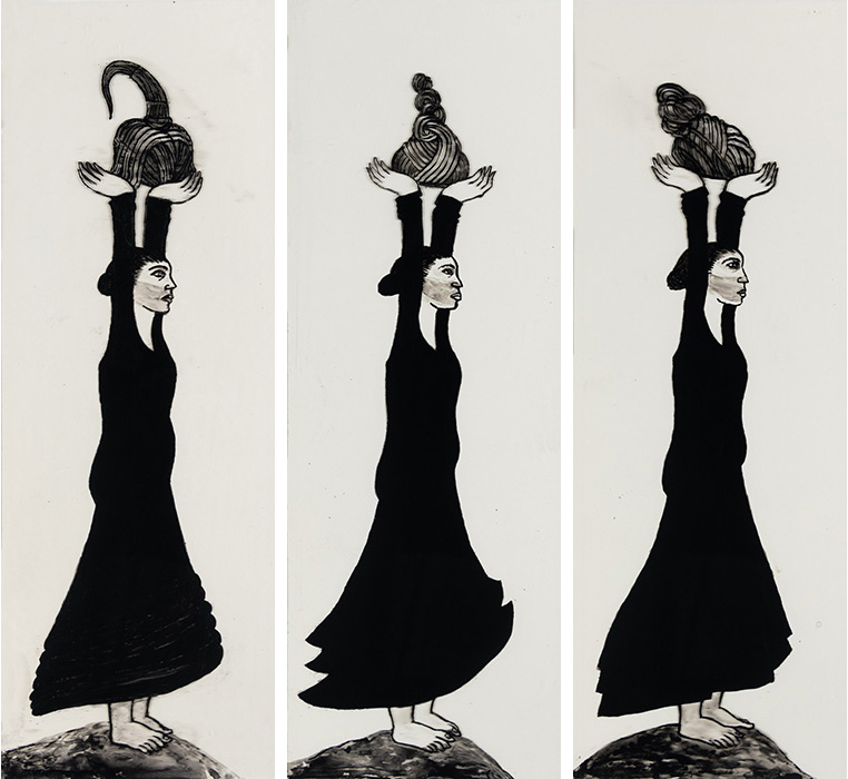 In the seven series of drawings in this exhibition the artist creates emblematic images of pain, violence, defeat and also of resistance and overcoming. Many works exude a dark and defeated mood as suggested by the titles of some of the series,`Fallen warrior’, 'Shattered’, ‘Antaheen’ meaning endless. Other works express energy and determination through a strong animated line. The interesting series 'Swaha' consists of twenty-one small reverse drawings done in acrylic on glass. The individual drawings are arranged as a procession. The similar looking women in each are all of a firm bearing and are seen walking forward holding what appears to be strangely shaped headgears above their heads. ‘Swaha’ is a term chanted at the end of a mantra, or in a ritual yadnya offering. It denotes an auspicious ending. The women in the procession seem to be moving forward to make a final offering of their burden and make themselves free agents. The series is a fitting finale to the exploration of injustice, exploitation and resistance in this exhibition. It gestures towards the possible release from a state of bondage, towards emaciation and fulfilment.