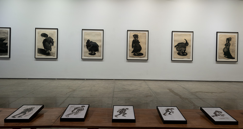 Shakuntala has expressed her concern with the life of women through different mediums and practices. Apart from this abiding subject matter, there is another element that connects Shakuntala’s varied practices. This is her drawing practice. Shakuntala Kulkarni makes drawings constantly and compulsively. Entering her studio is like entering a cave with drawings all around you. There are drawings on walls, on boards, and pieces of paper pinned on doors. It seems that all the artist's ideas find their first expression in drawings. The ideas for her cane armour and costumes, her installation works and also her videos, have all taken shape through countless drawings. Shakuntala has exhibited her drawings with work in other media in many of her exhibitions, and viewers are familiar with her drawing practice. It is however after many years that she is here presenting a full exhibition devoted only to drawings, all recent. Drawing has been central to the artist’s multi-faceted practice and this exhibition of drawings allows us to focus on an elementary aspect of the artist’s creative process. Though these are all conceived as independent and finished drawings, they share the spontaneous and raw quality of her preparatory work. Shakuntala uses a range of mediums for her drawings. There are large charcoal drawings on handmade paper here; and there are also small reverse drawings in demography pencil and acrylic on museum acrylic sheet and glass. The variety of thick, thin, sinuous, regular or scraggly lines and the density of charcoal have made the exhibition a visual treat.